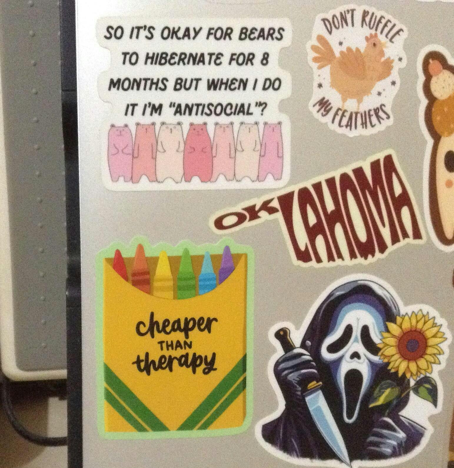 You may not be able to afford therapy, but you know what you can afford? Cooloring books! Show off a bit of mental-health-meets-coloring humor with this crayon sticker.